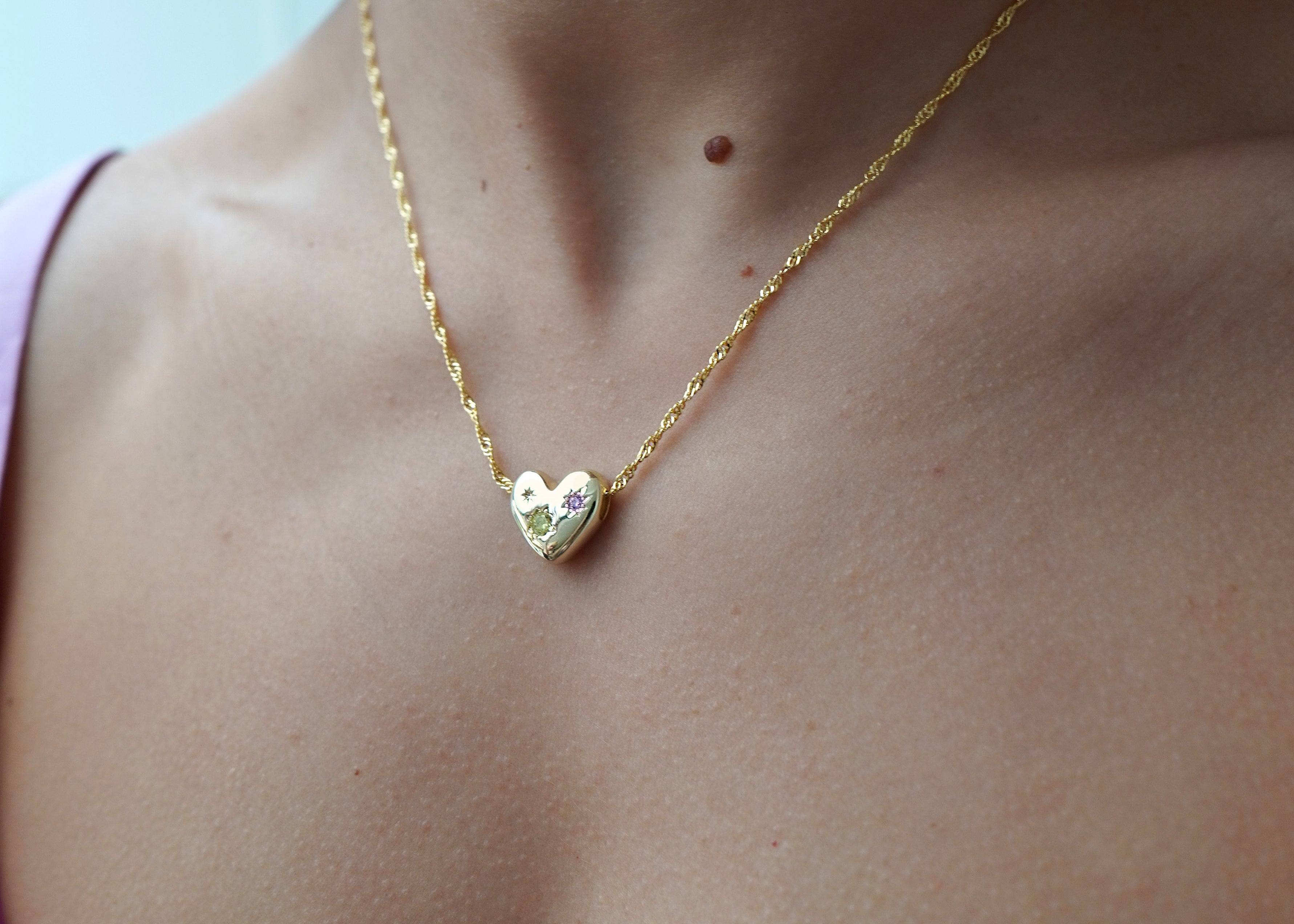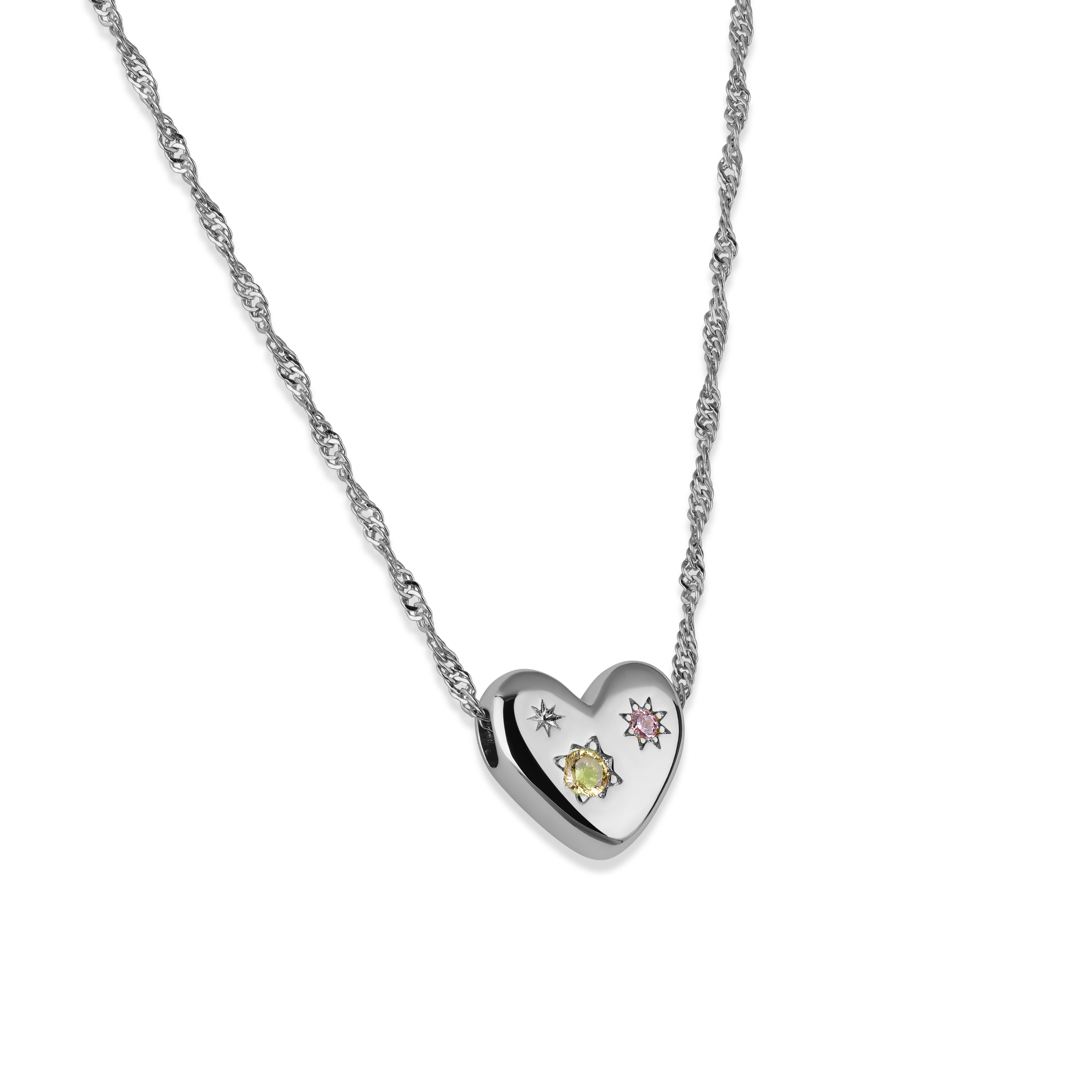 The sparkling peridot-green and pink jewelled heart charm is a sweet addition to this dainty singapore chain necklace. When you wear this dazzling charm, we’re sure you’ll have your friends green with envy. The charm 'floats' and is moveable along the choker style chain.
