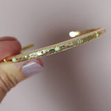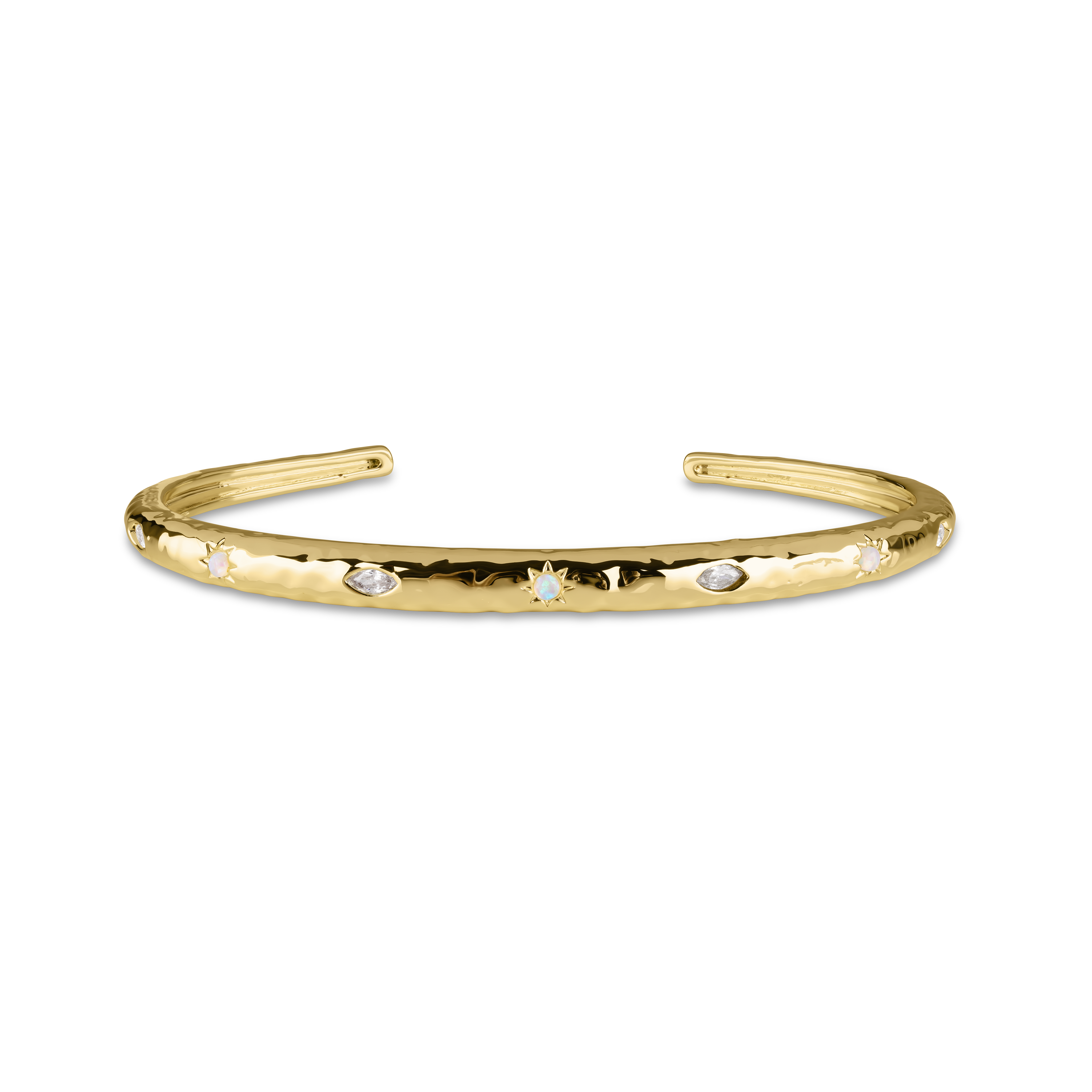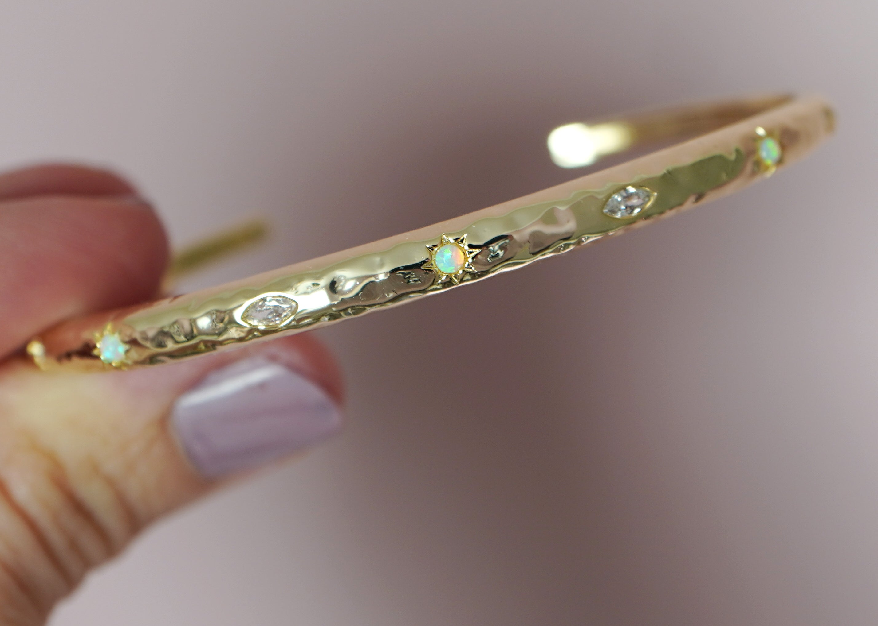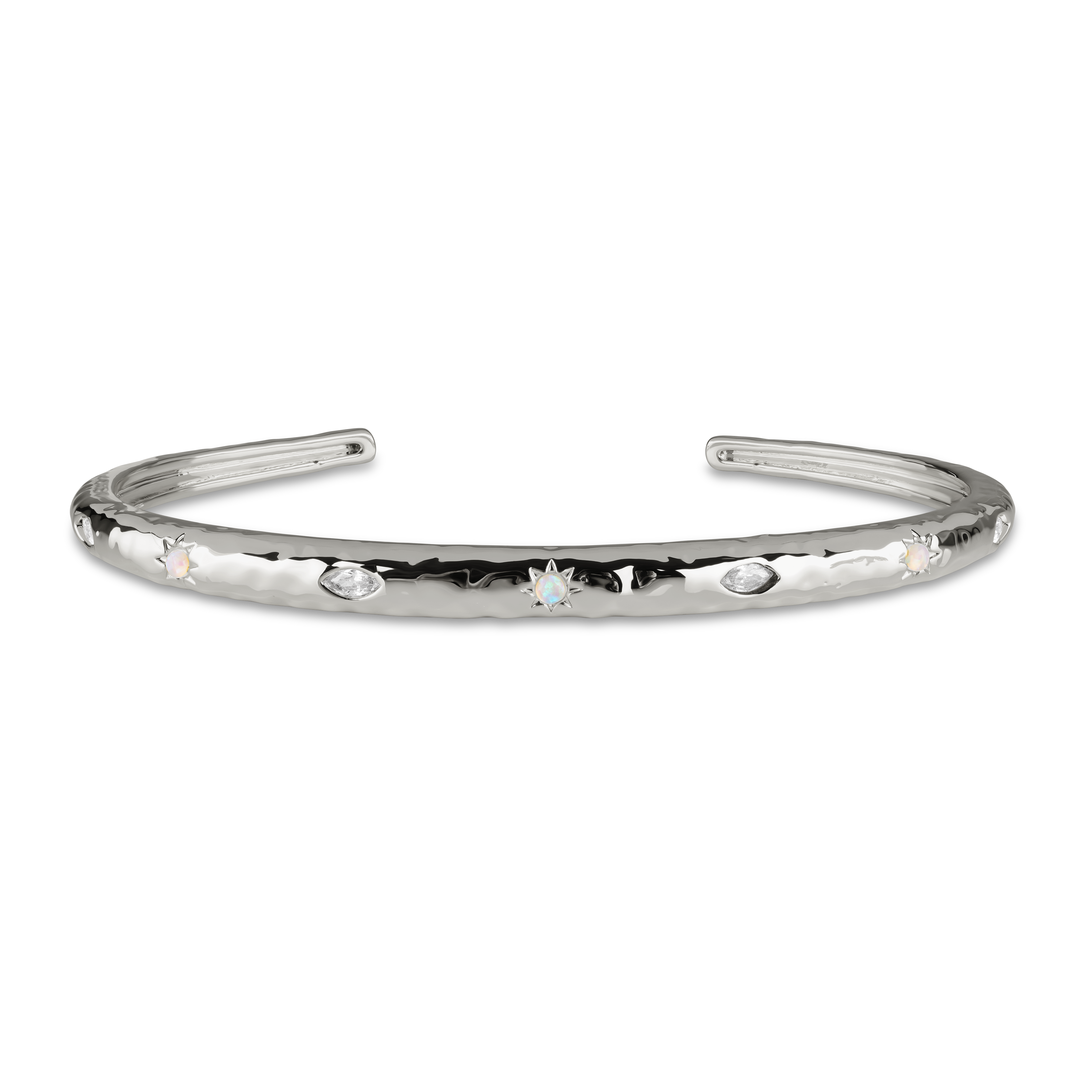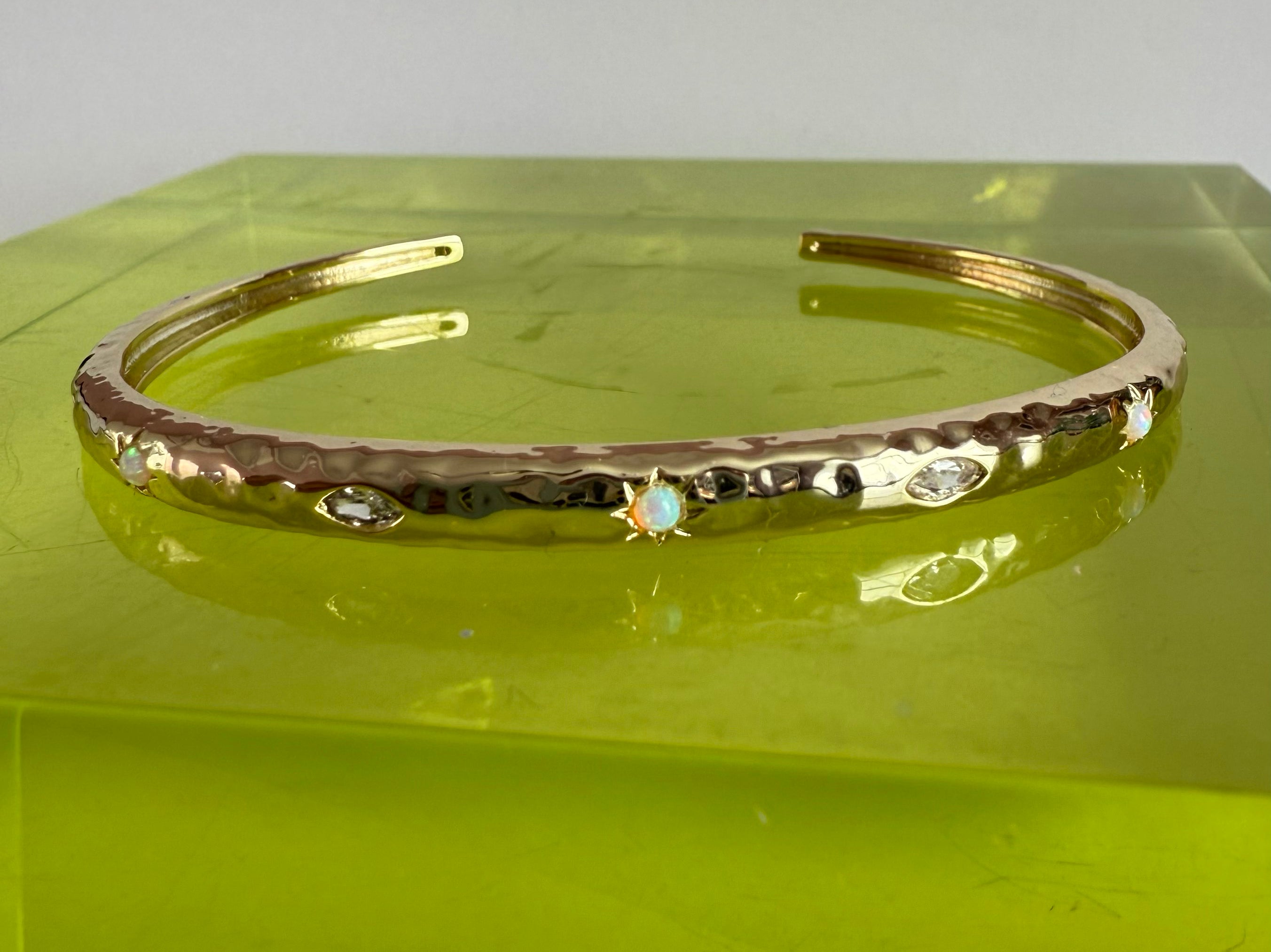 Decorated with opals and white cubic zirconia, this whimsical bangle shines like a milky way - magical and beautiful.The marquise shaped cubic zirconia sit beside starburst detailed opals and the hammered texture on the metal is the finishing touch. This delightful collection of jewels is such a hit we made a matching ring and earrings … you’re welcome!