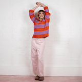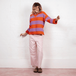 Effortlessly add a pop of color to your wardrobe with our Millie crochet stripe jumper! The delicate crochet stitch, boxy fit, and turn up cuff make it the perfect summer piece for layering over midi dresses or as a beach coverup on vacation. Plus, it's sustainably made in the UK with recycled cotton blend yarn. Stand out in style with this versatile and eco-friendly sweater!