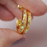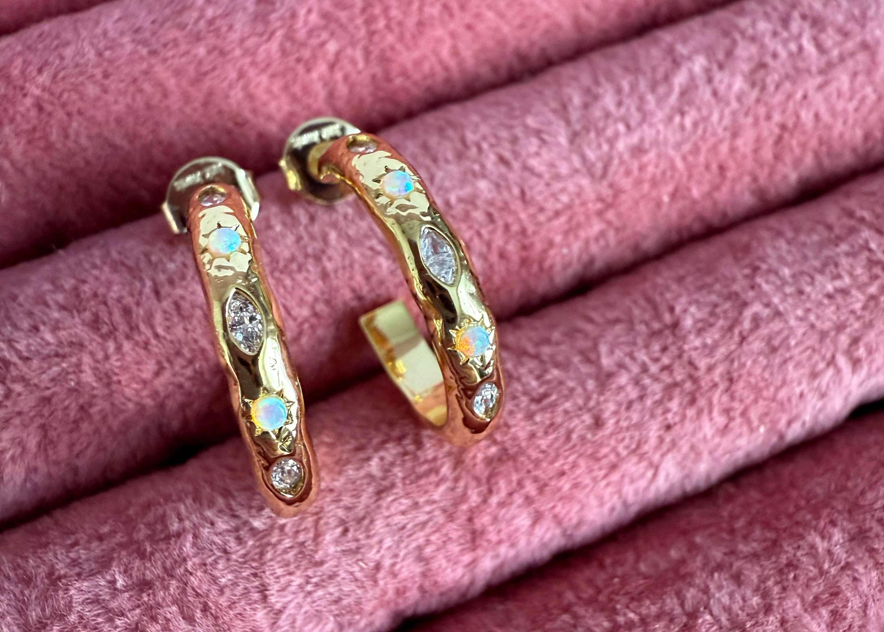 Decorated with opals and white cubic zirconia, these whimsical hoop earrings shine like a milky way - magical and beautiful. The large sized hoops are embellished with marquise shaped cubic zirconia sit beside starburst detailed opals and the hammered texture on the metal is the finishing touch. This delightful collection of jewels is such a hit we made a matching ring and bangle … you’re welcome!