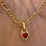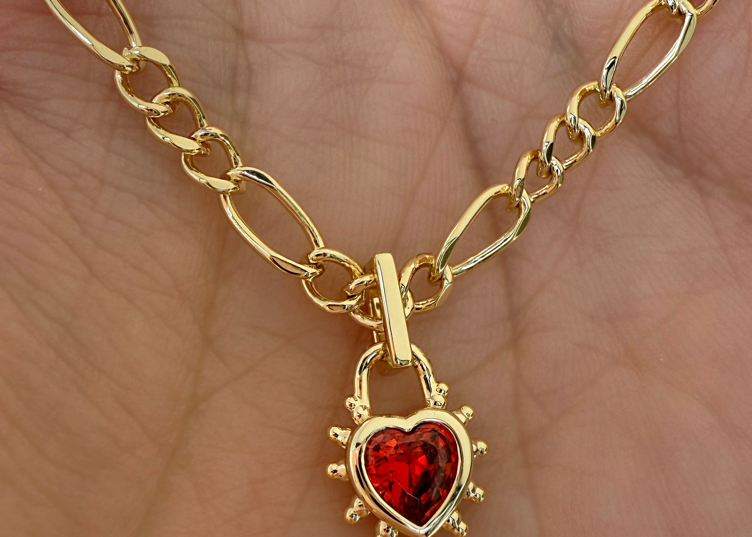 The sparkling ruby jewelled heart charm is a sweet addition to the chunky figaro chain necklace. When you wear this dazzling charm, we’re sure you’ll fall in love.