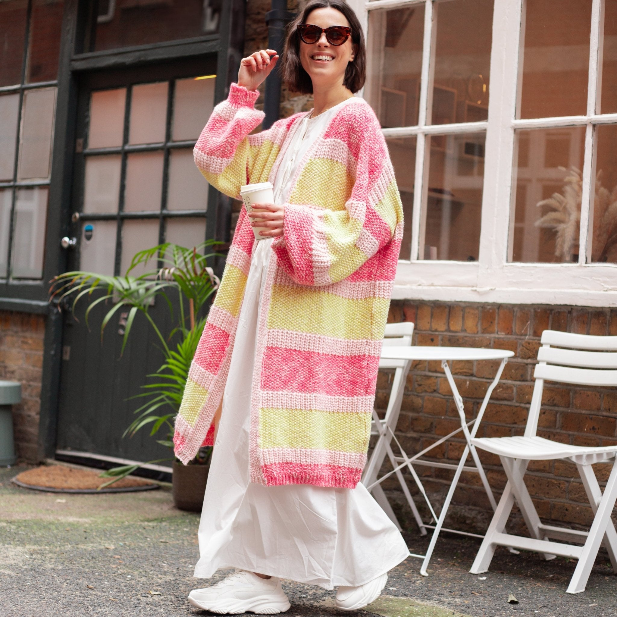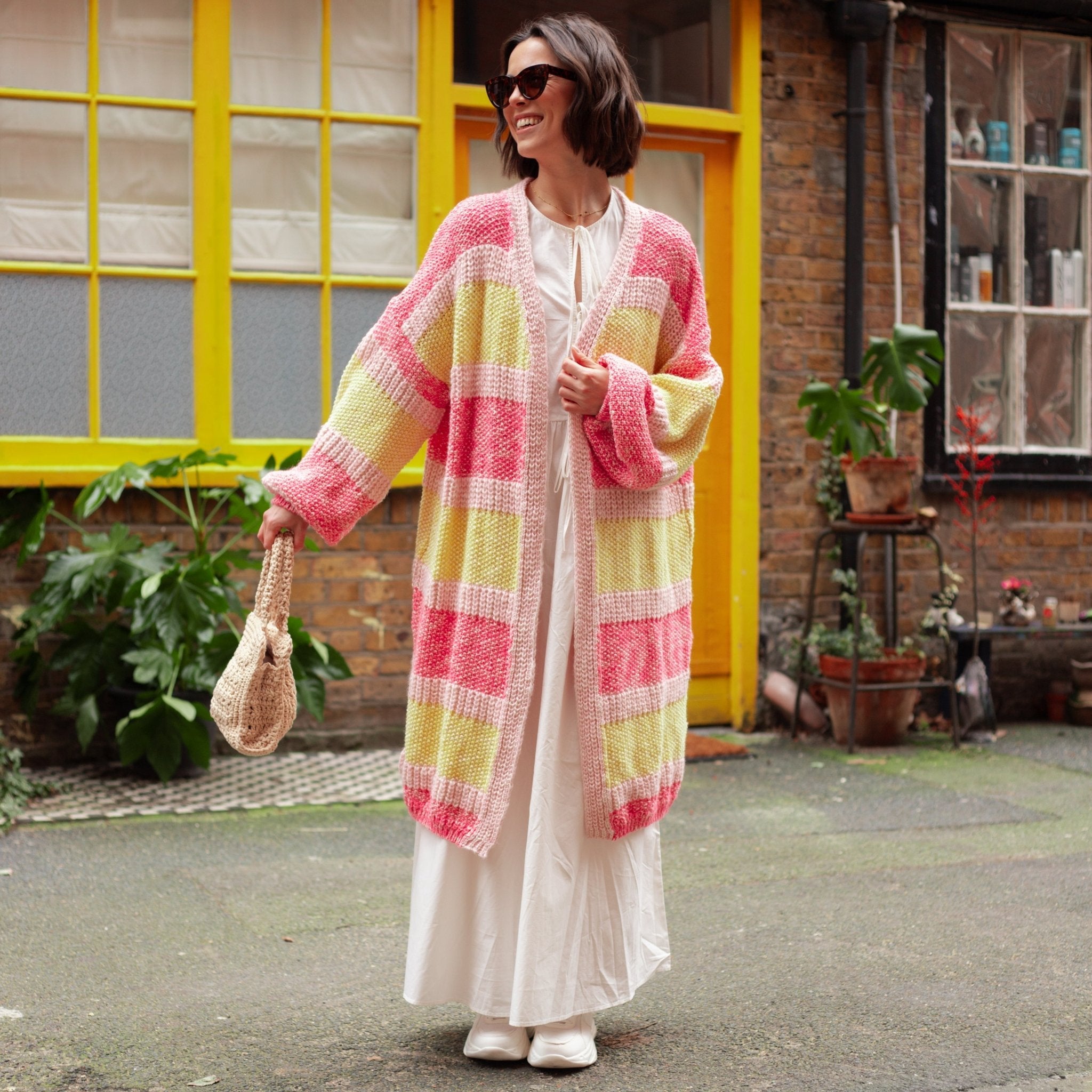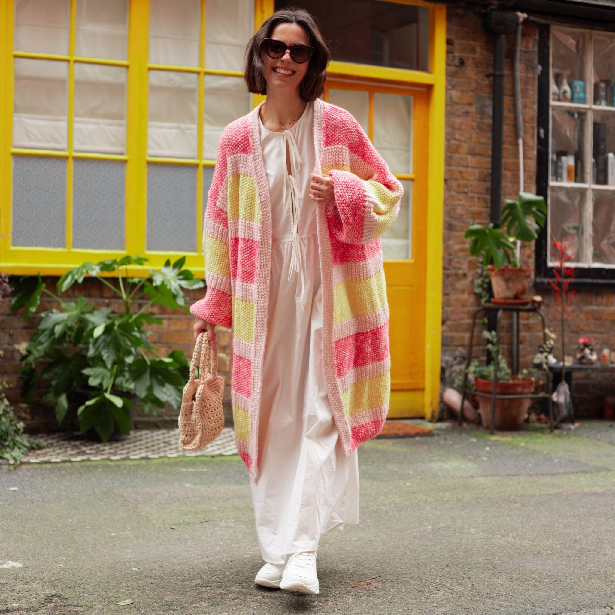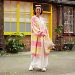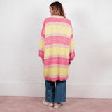 Oversized, Striped, Balloon sleeves, what more could you want from summer cardigan? In a lightweight recycled cotten blend yarn this has pops of pink & yellow which layer perfectly over any outfit. In the relaxed oversized cardigan shape this is the perfect style for a beach coverup or to layer over your summer maxi dresses.