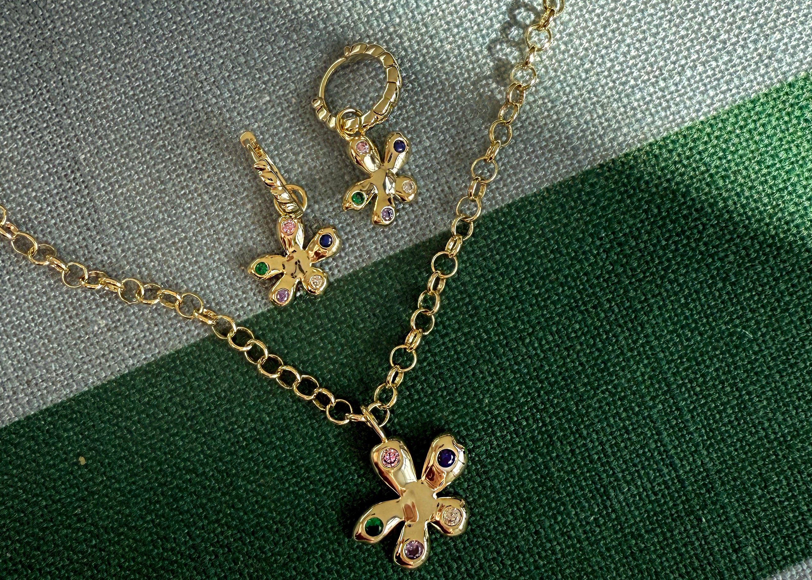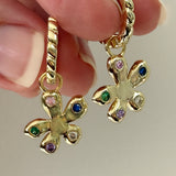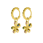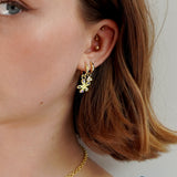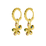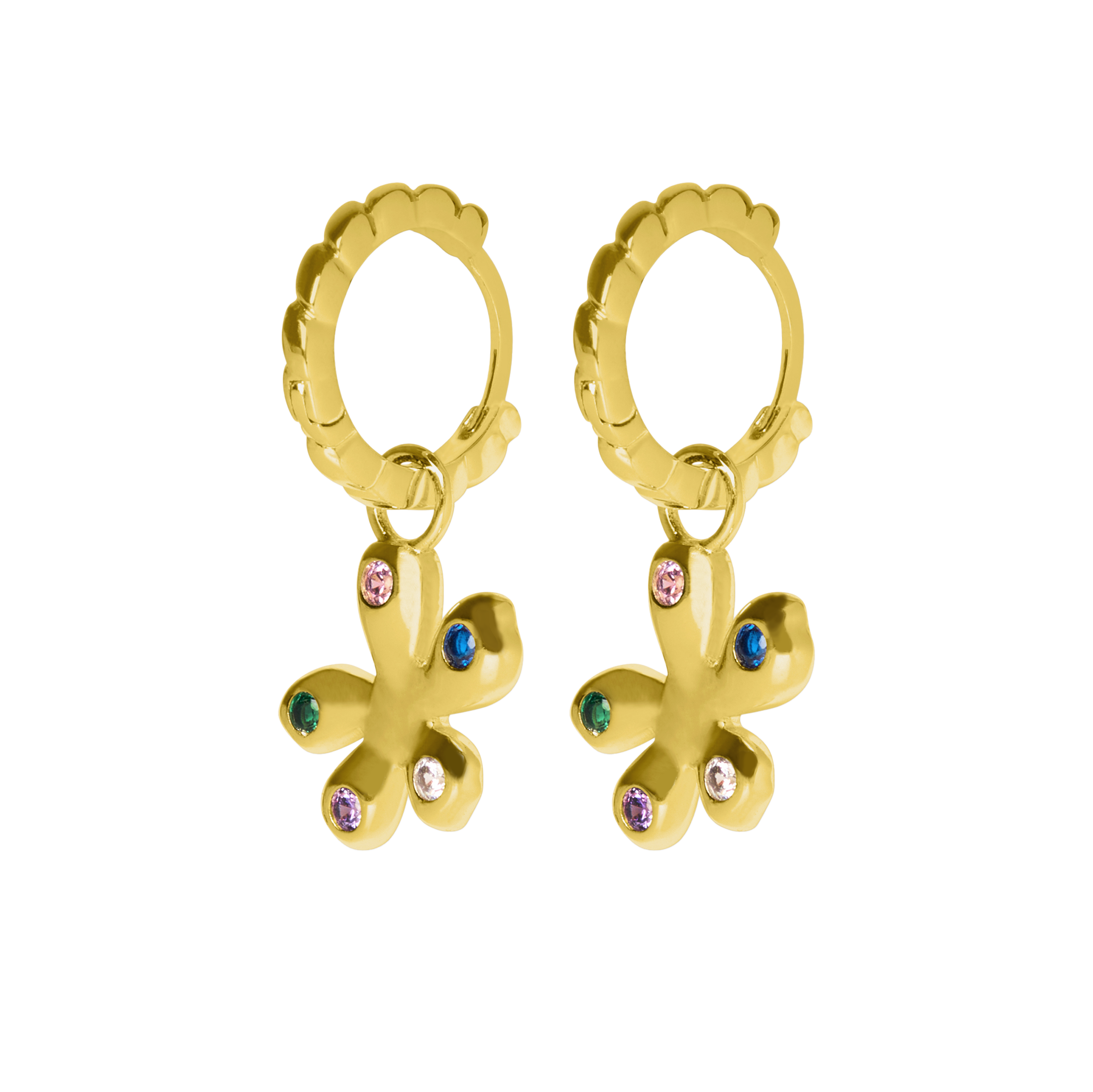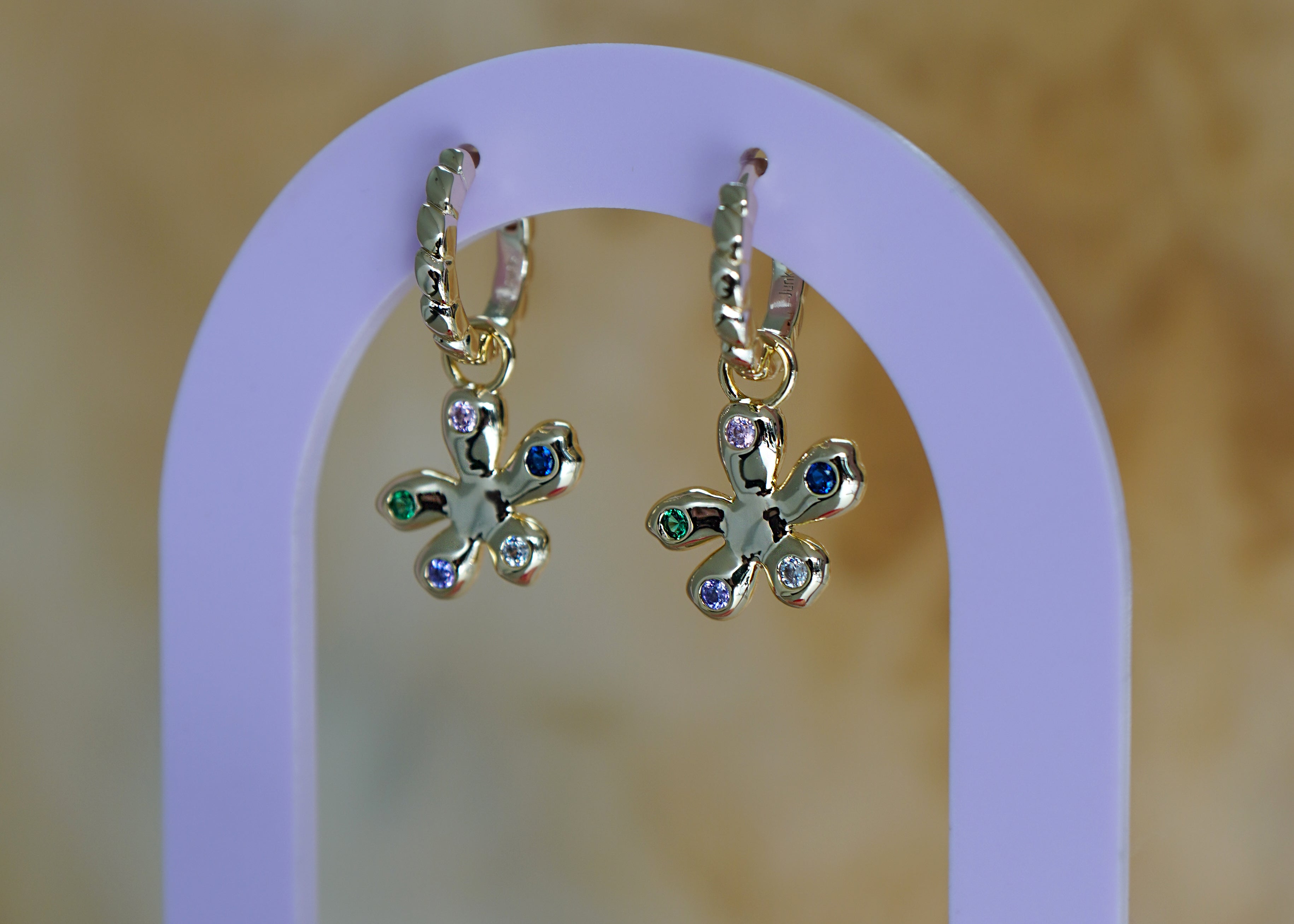 The whimsical wildflower charm is a sweet addition to the small but chunky, twisted hoop earring. The charm is encrusted with a colourful array of cubic zirconia gemstones in pink, lilac, yellow, green and blue.